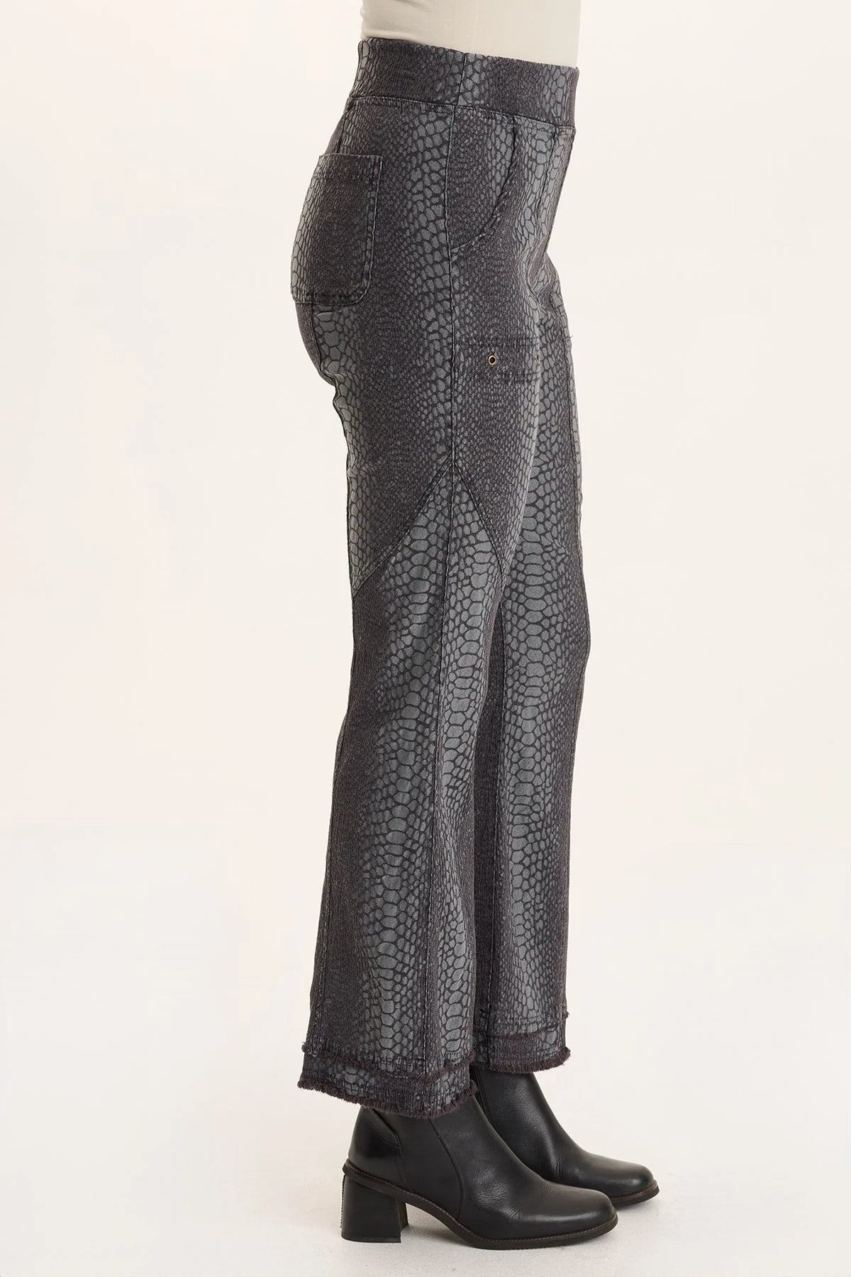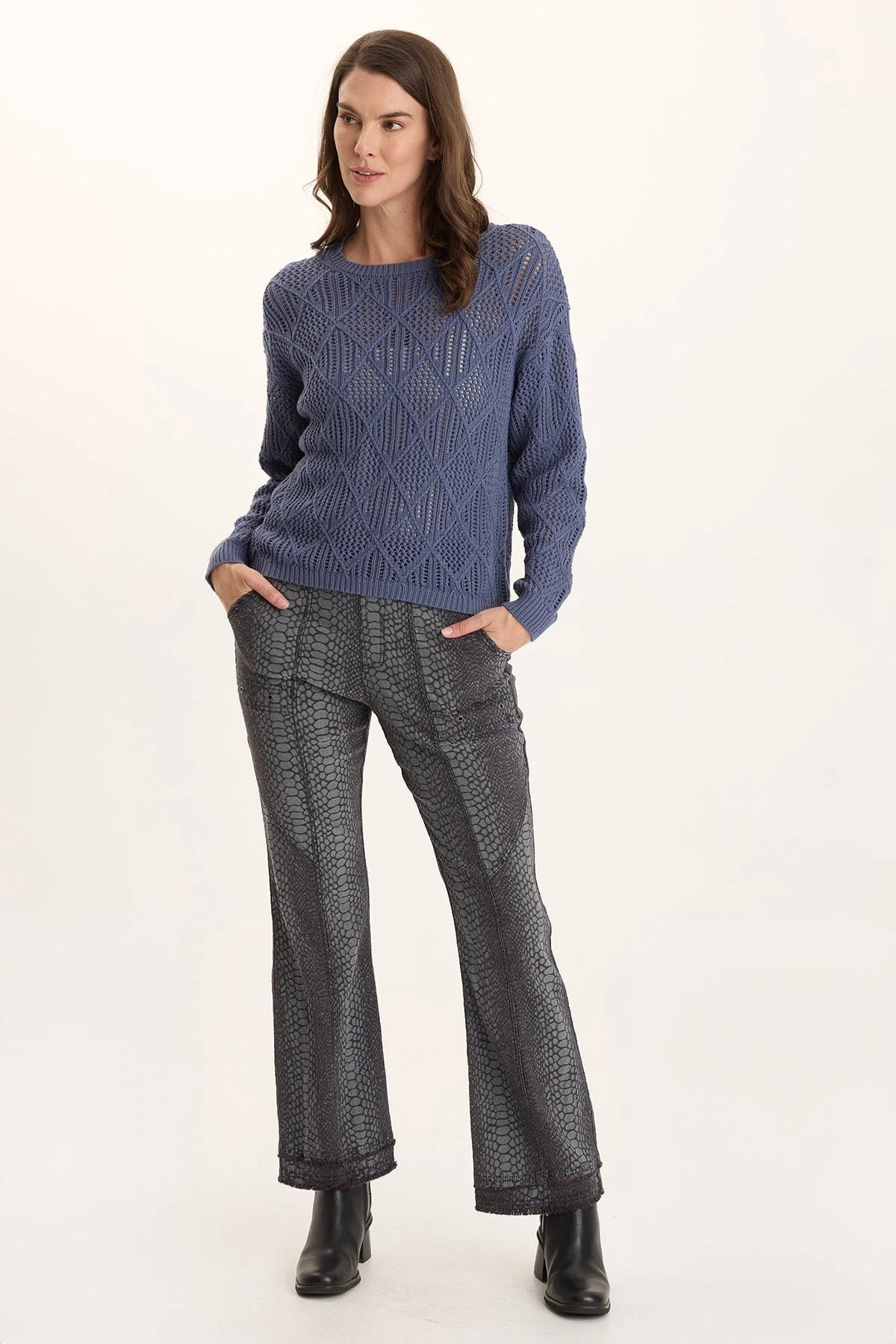 A gentle, cheeky flared silhouette leans into the uniqueness of this textured Camille Jacquard pant. With a distressed double hem, pull-on waist, and brass eyelet-adorned pockets, Askell is asking to become a wardrobe staple and statement piece all in one.
