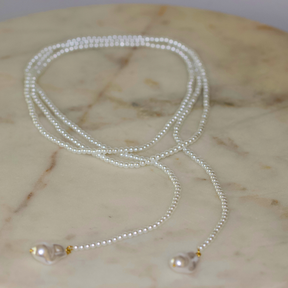 Elevate your everyday style with the Wrap Pearl Lariat Necklace featuring luminous glass pearls on a 48-inch flexible lariat chain in 18K gold non-tarnish stainless steel. This extra-long pearl necklace gives you endless styling options,