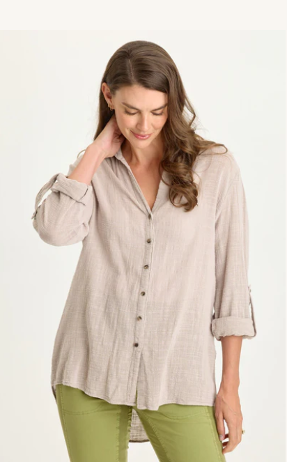 This gauze button-up blouse is great for layering. Features tabbed sleeve for easy rolling, curved hemline, and a box pleat on back.