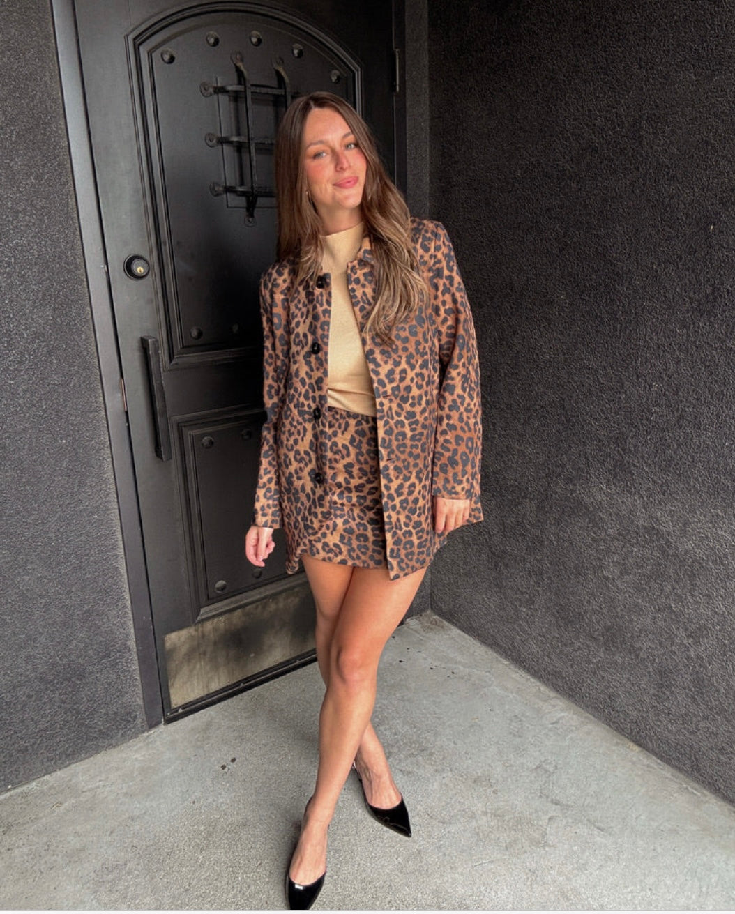The Sharon Animal Print Coat features striking black button details and a classic collar, combining style with timeless appeal. Crafted from soft fabric, it offers comfortable wear while its mid-length cut provides versatile coverage perfect for various occasions. Elevate your look confidently with this stylish and cozy outerwear piece.